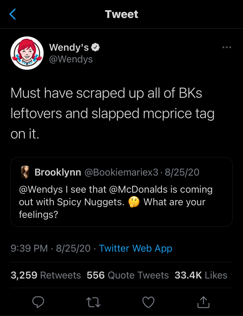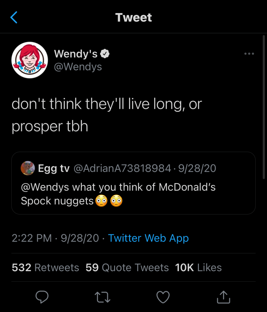 Wendy’s is the perfect example of a snarky and spunky writing style on social media. They use attitude and informal conversation in their messages to provide entertainment and get reactions from their audience.This writing style also relates to wittiness, which incorporates humor and cleverness in brand messages, bringing conversation and fun to the audience. These writing styles are mainly seen on Twitter (or, better yet, Tumblr).